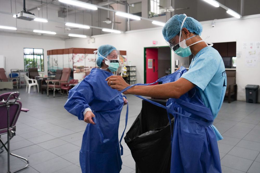 Personnel from the CASA-MODAL team removing their PPE after a long day. (Photo by Chan May Ching)