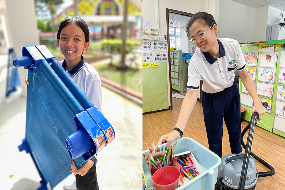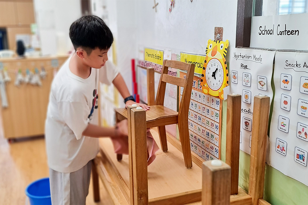 “Chairman” Toh Kang Wei was assigned to clean the chairs in the classroom.  (Photo by Lim Lay Hong)