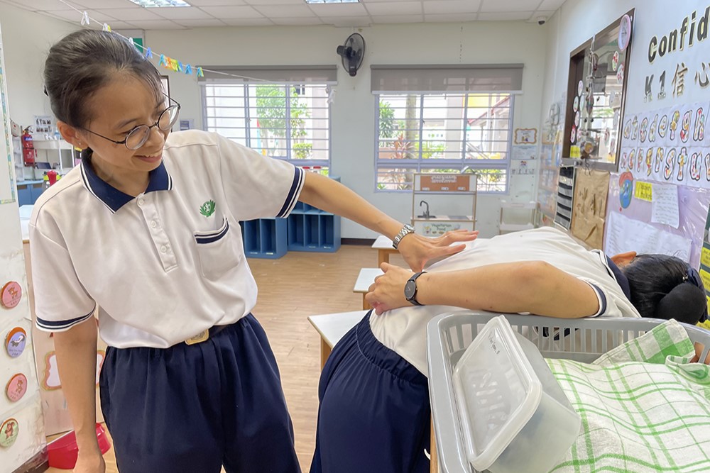 Teacher Ms Chong Chee Sia giving a fellow teacher a massage to relieve her back pain during the spring-cleaning session.  (Photo by Yong Keah Pei)