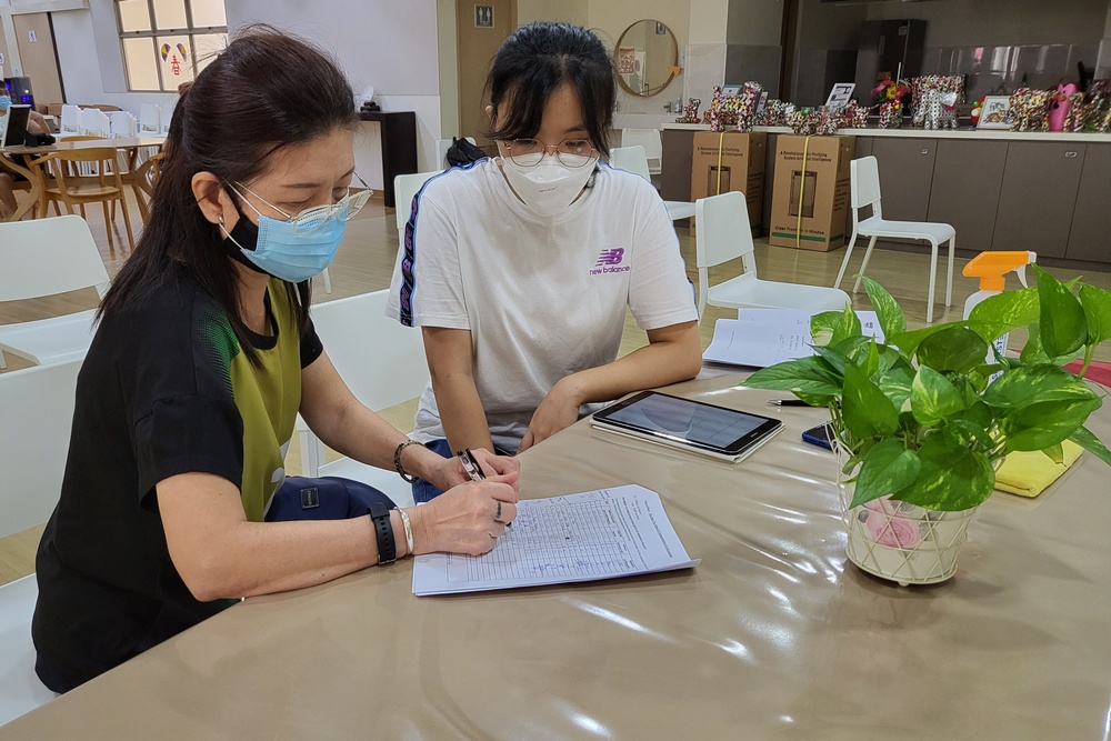 Ms Ng Ng Siew Geok (left) filling up a survey form upon completion of the VR activity. (Photo by Wong Yen Hoon)