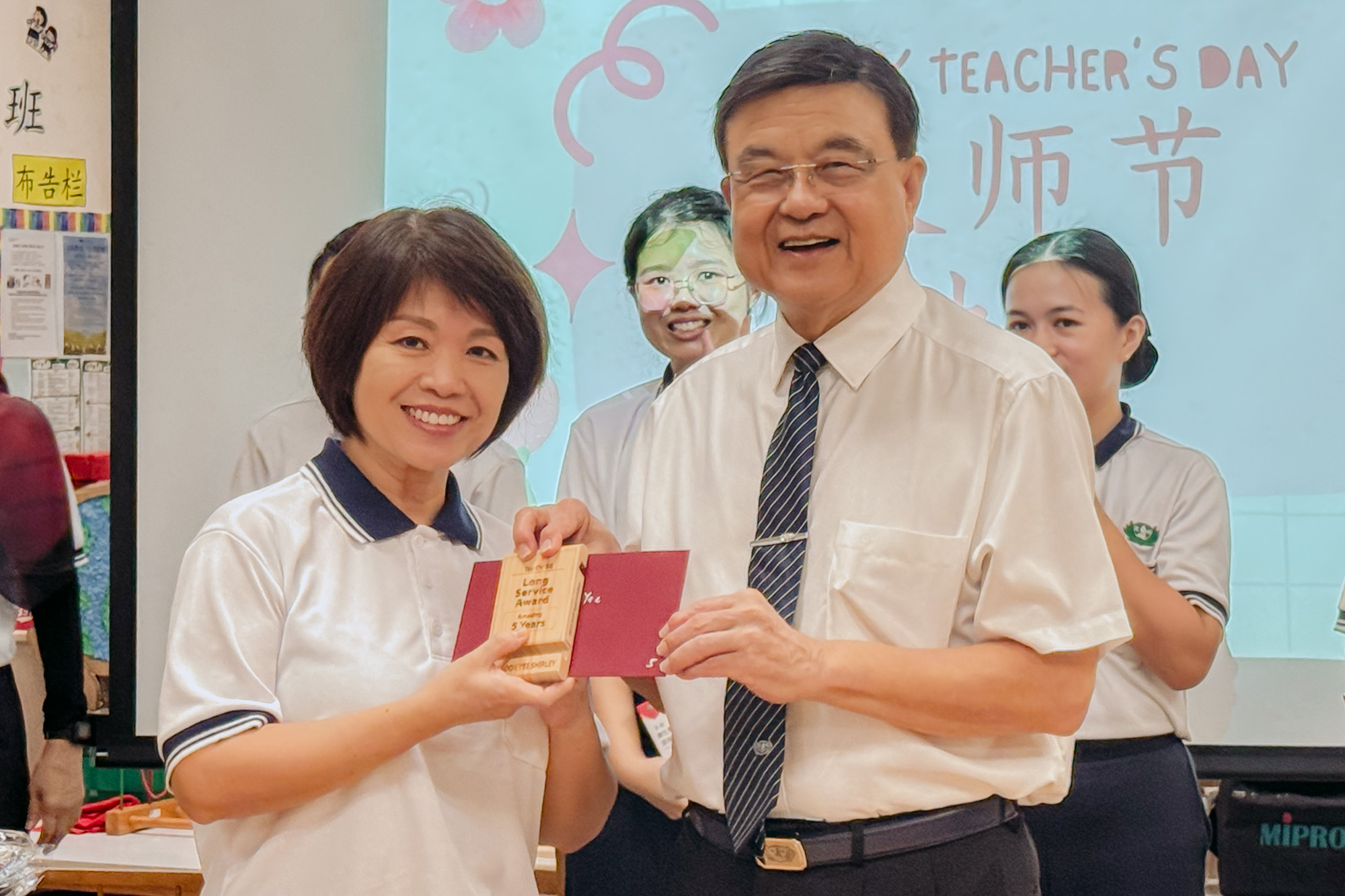 CEO Low Swee Seh presenting the "Five-Year Long Service Award" to teacher Shirley Lum Sook Yee in recognition of her contributions over the years. (Photo by Au Foong Yee)