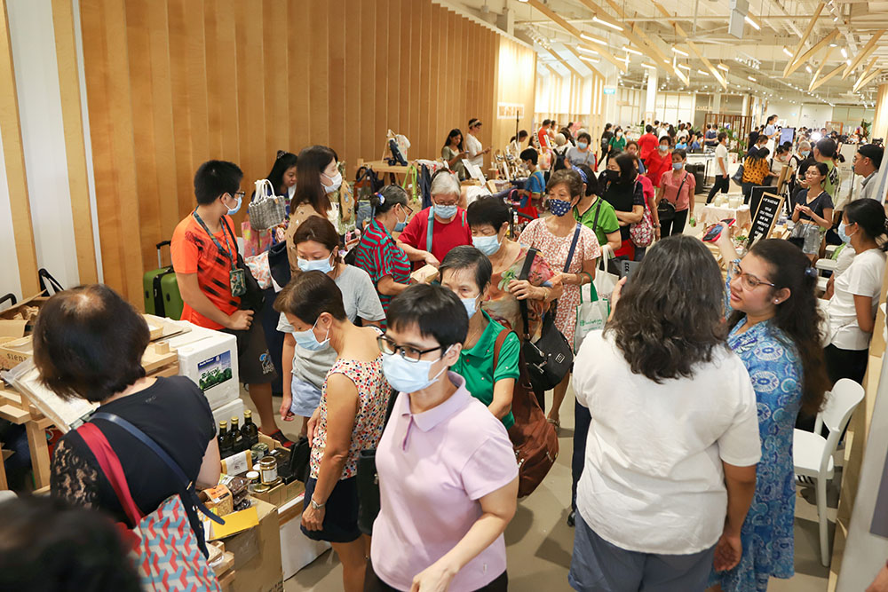 Crowded with people, this meat-free and plastic-free market offers many vegetarian food-tasting stalls and interactive zones. (Photo by Chua Teong Seng)