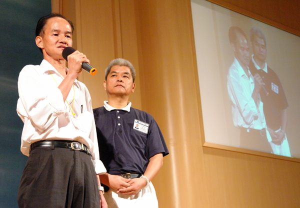 On 9 September 2006, after the unfortunate passing of his son, Guan Zheng, Chen Ming Fu drew strength from his grief and took his son’s place onstage during the Mid-Autumn distribution event, sharing his experience and encouraging those who were stricken by illness. (Photo by Wu Xiao Hong)