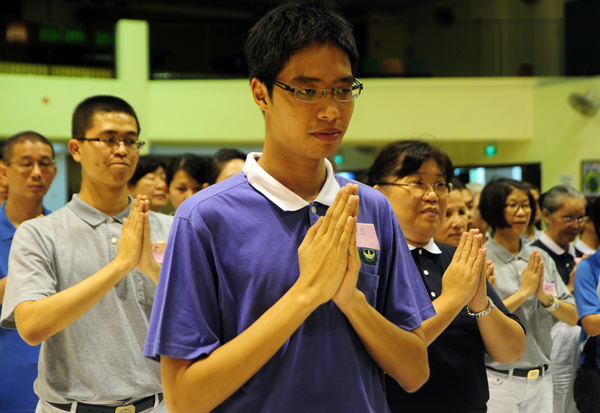 In the past, Chen Guan Wen had the impression that Tzu Chi was solely a religious organization. He told his father that he would like to join Tzu Chi Collegiate Youth Association (Tzu Ching) only after he entered NUS. With his son's wish in mind, Ming Fu requested that the volunteers guide his son and six months later, Guan Wen successfully donned the Tzu Ching uniform. (Photo by Pua Poo Toong)