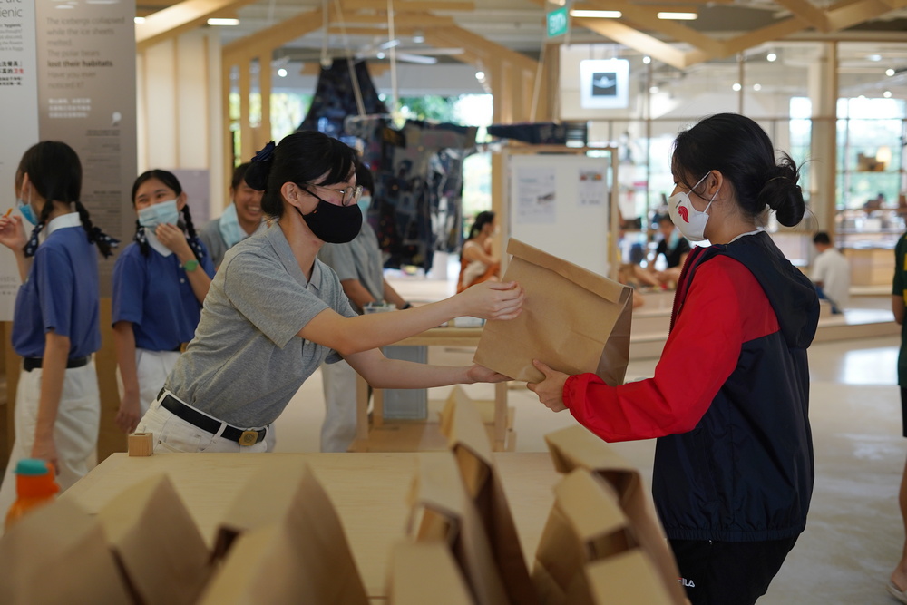 Ms Lee Zhen Hui (right) would volunteer in various activities such as the distribution of care packs to students studying at Tzu Chi Humanistic Youth Centre (HYC). (Photo by Chong Yu Jia)