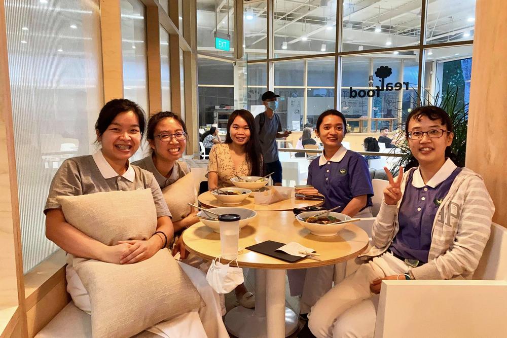Ms Chew (extreme left) and Ms Leong (second from left) are good friends and would often gather together for meals after volunteering. (Photo provided by Leong Sheau Zhin)