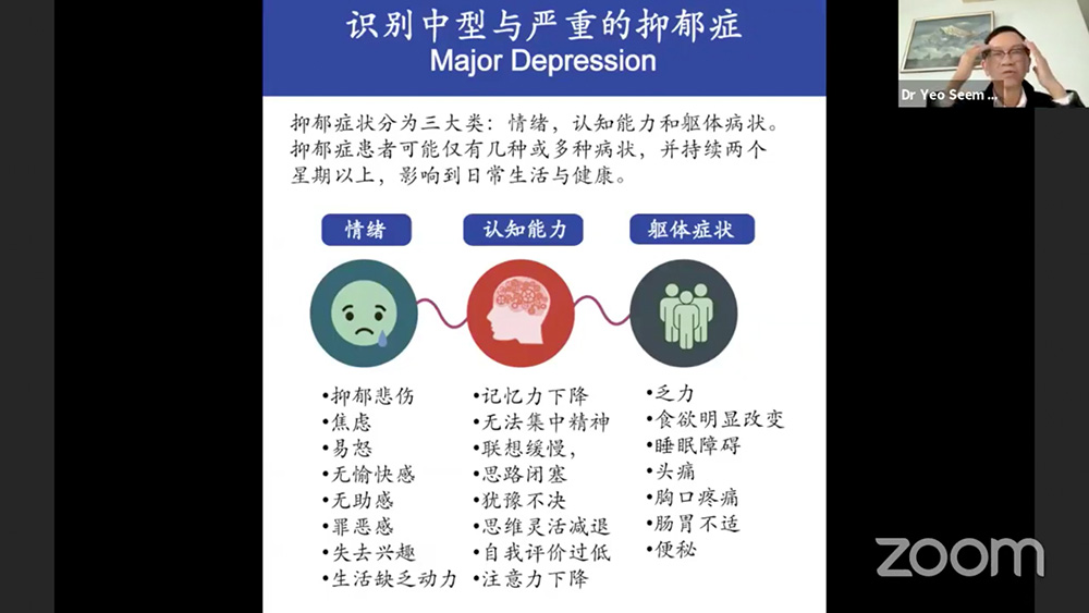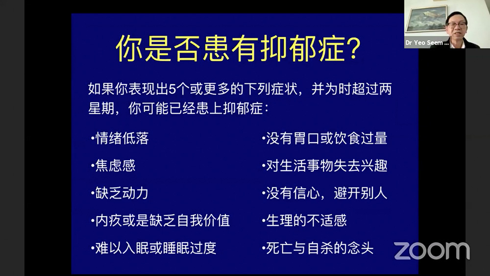 2021年新加坡慈济实业家联谊会(简称实联会)邀请了杨新发心理医师主讲系列分享会,7月25日的第三场讲座《战胜抑郁,重見彩虹》共吸引310名听众与会,反应相当踊跃。最后一场线上讲座《如何预防失智症》将在9月26日下午三点至五点举办。