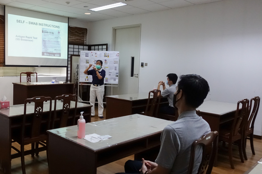 拥有多年护理经验的林金燕向职工示范如何正确使用ART检测器。(摄/曾美珍)