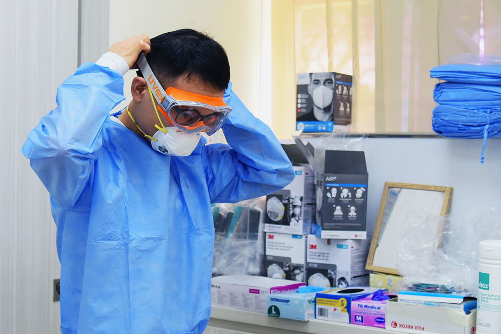 回到这一天上午,是陈俊耀的门诊时段。他在两间诊室之间来回穿梭,每看完几个病人,就迅速换上全套个人防护装备(PPE),快步走入另一间诊室,为有急性呼吸道症状或在家自测冠病结果呈阳性的公众,做抗原快速检测(ART)或聚合酶链式反应(PCR)测试,检测完毕又继续看病,没有一刻停歇。