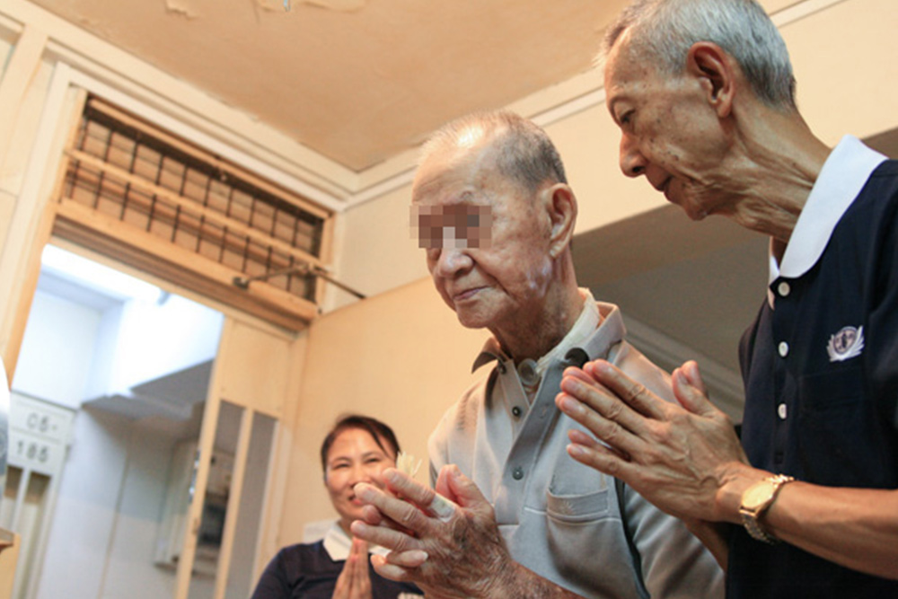 2015年的“佛到家、福到家”流动浴佛活动,黄国良(右)、罗翠兰(左)和三位志工到照顾户家中,用心地陪伴照顾户长者虔诚浴佛。(摄/ 冯桂琼)