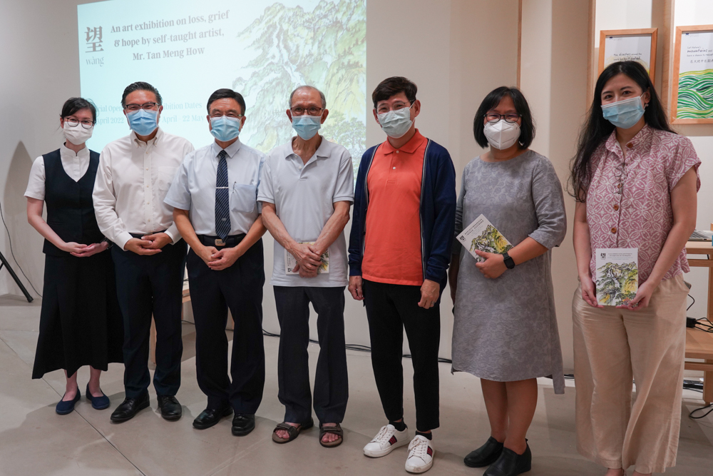 慈济人文青年中心和 “蒙福关爱”的“愈援”运动携手联办艺术展“望”,希望把艺术带入社区。左起为青年中心经理林杏纯、慈济基金会(新加坡)西医室医疗顾问林文豪、执行长刘瑞士、创作者陈孟浩、蒙福关爱中心执行长黄明德、“愈援”计划负责人朱慧儿和该计划的艺术治疗师郑淑文。