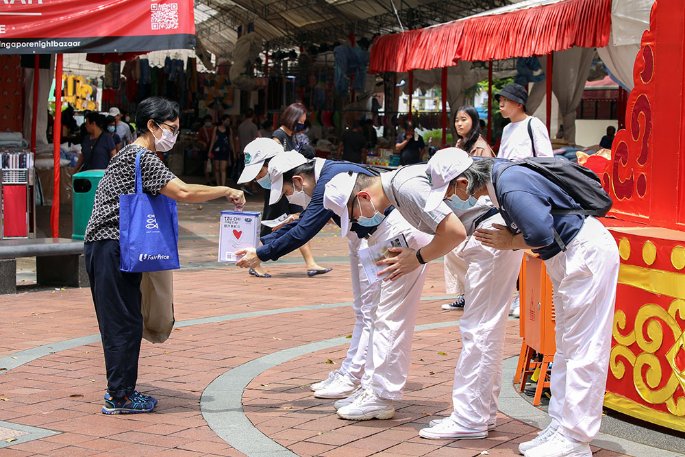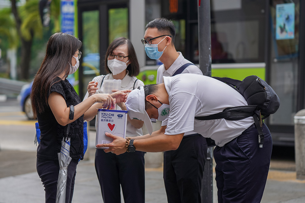 今年9月24日是2022年慈济募款日,全岛701位慈济志工遍布在新加坡全岛73个据点,包括地铁站旁、组屋楼下、巴刹、庙宇旁等进行街头劝募。新加坡九月多雨,当天早上多个地区下起倾盆大雨,但志工风雨不改,稍微移向避雨处又继续募款,民众也大力呼应。