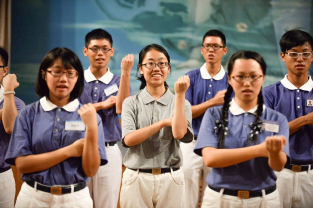新加坡毕业慈青、在籍慈青和陪伴志工虔诚地双手合十,通过视讯连线向远在台湾花莲的证严上人发愿。(摄/ 王家晖)