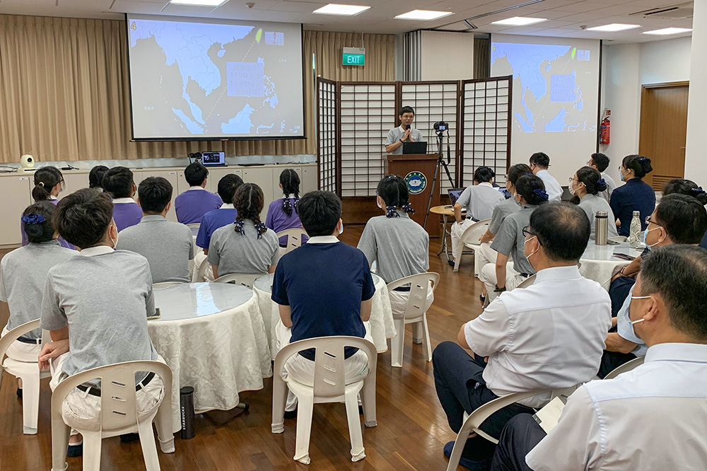 2022年10月15日, 新加坡慈青与师公上人温馨座谈,颜明德(台上讲者)回顾新加坡慈青26年来的足迹。(摄/ 王家晖)