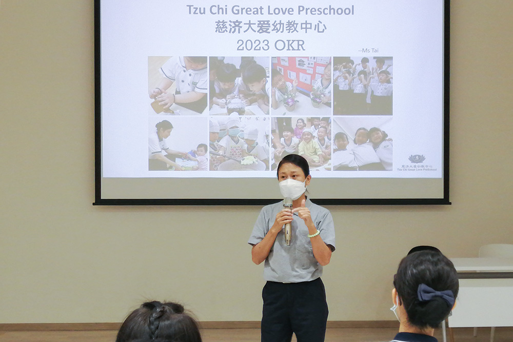 主管戴钰郿透过2022年10月的SWOT分析让教职员了解幼教中心未来的努力方向,订立2023年目标与关键成果(OKR)的发展要点,两所幼教中心园长林丽芳和卓依玲也接着分享来年优先改善的指标,如以活动提升家长参与度和善用“亲子桥联络簿”等,期待全校上下一心,达到OKR评鉴的目标。会上也探讨教师守则更新、教学盘点与分享等,众人热烈讨论,也无私分享教学案例。