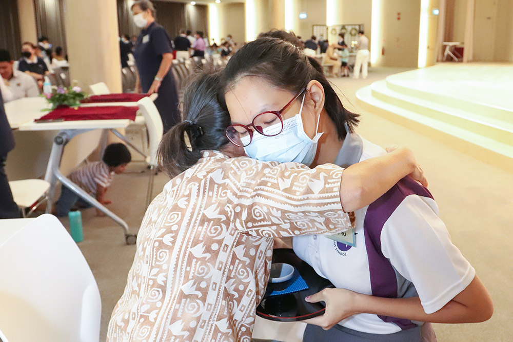 颁奖典礼后,孩子们整齐列队在奉茶区等候入场,等着恭敬地为父母奉上一杯感恩茶。接过儿女献上的茶,父母脸上充满着感动,有的回以孩子一个深深的拥抱,场面温馨感人。