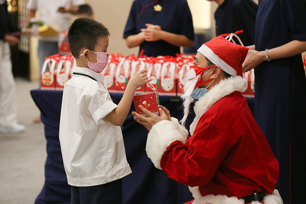 时值圣诞前夕,圣诞老人在典礼尾声将结缘品分发给每一个人,分享爱和喜悦。(摄/ 蔡长盛)