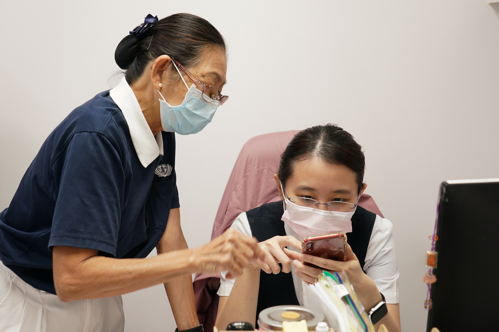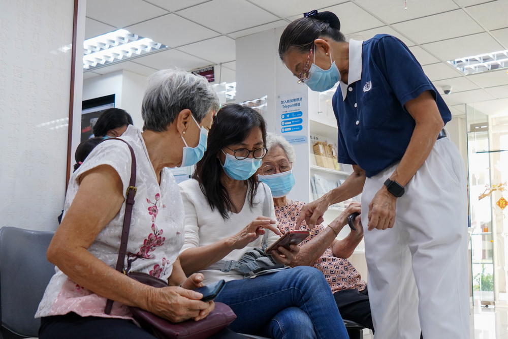 顾玉好(右)和病人之间建立了一定的信任,当她使用手机时遇到问题要求助,也会向他们不耻下问。(摄/ 曾美珍)
