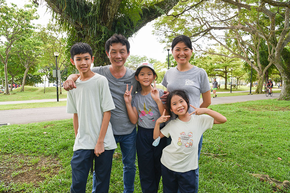 李美珊(右二)和先生带着儿子陈弘智(左一)和两个女儿来净滩,透过言传身教,希望孩子成为守护环境的一分子。