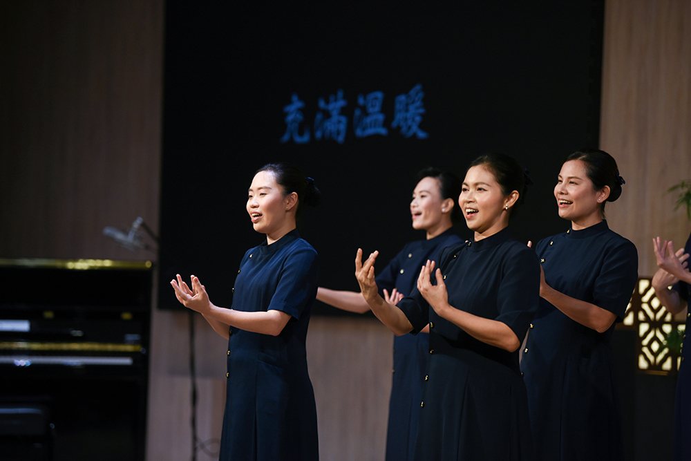一首接一首经典名曲,间中还穿插慈济志工手语演绎。“当你懂得了体谅,你的生活再也不会有惆怅,当你明白了这道理,你心情将会更开朗……”慈济志工手语演绎一首《温暖》,让观众沉浸在一片祥和曲声中。