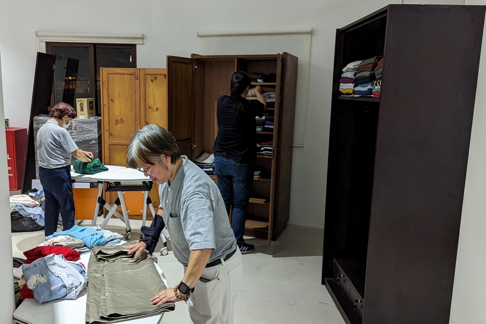 “快时尚”展区的二手衣物,由志工协助一件件整理和叠放。(摄/ 郑颖坪)
