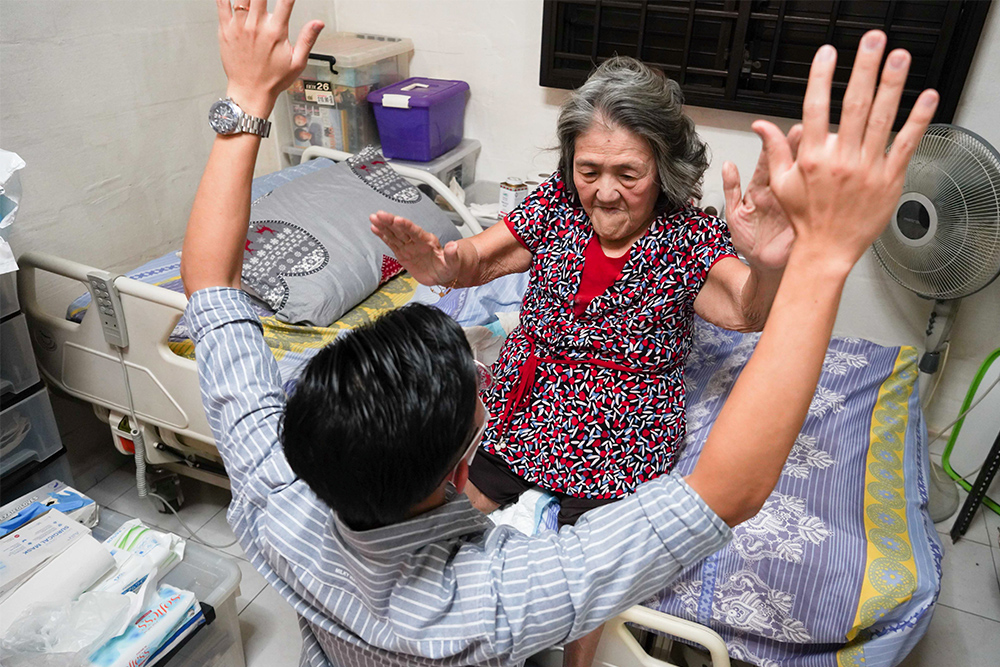 杜太太不太愿意下床,物理治疗师林明贵先请她在床上做简单的复健训练,建立信心。(摄/ 曾美珍)