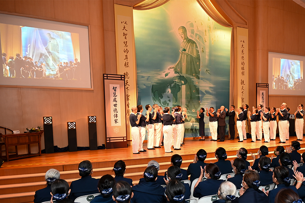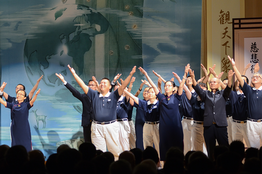 各部门职工代表、社区干部和资深志工一起在台上演绎手语《大爱航向新世纪》,感恩前人的付出,在新旧轮替中,慈济人脚步不停歇,代代相传。(摄/ 黄建兴)