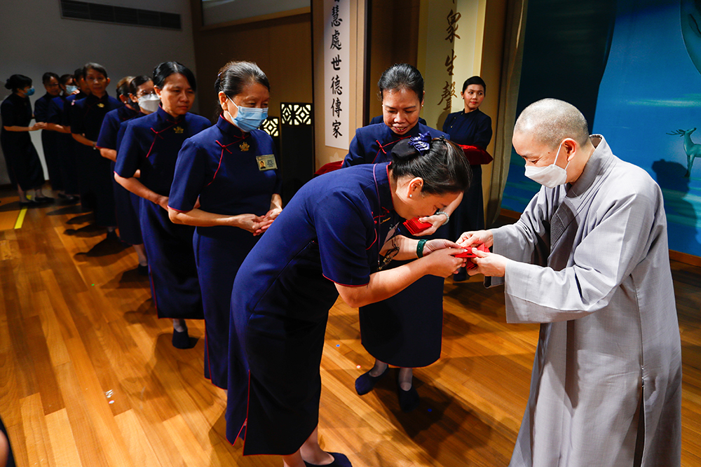 德勷师父和德格师父从台湾专程带来了今年的福慧红包,分发给出席的每一位志工与职工。(摄/ Daniel Ceng)