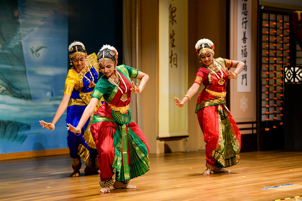 其中一组印度舞蹈表演由三位年轻⼥生呈现,她们脚踏地板铿锵有力,服饰绚丽,舞姿灵动。(摄/ 蔡佑良)