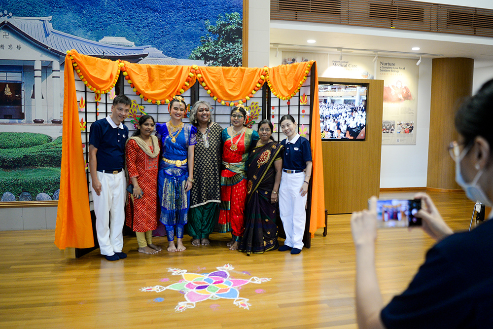 一踏入静思堂大门,就可看到亲切的志工引导照顾户报到,不远处的地上有七彩缤纷的印度传统图腾“Rangoli”,这是照顾户莎米拉(化名)提前几个小时抵达,精心绘制而成的。莎米拉开心地说:“大家聚在这里就像一家人同欢共庆,而我也想出一分力。”