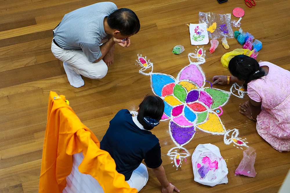 提前数小时抵达,精心绘制印度传统图腾的照顾户莎米拉,除了本身抱有浓厚兴趣外,更是想要以此方式回馈大家。正如她在地上绘制的六盏灯,象征着希望能照亮他人,她说:“大家聚在这里就像一家人同欢共庆,而我也想出一份力。”