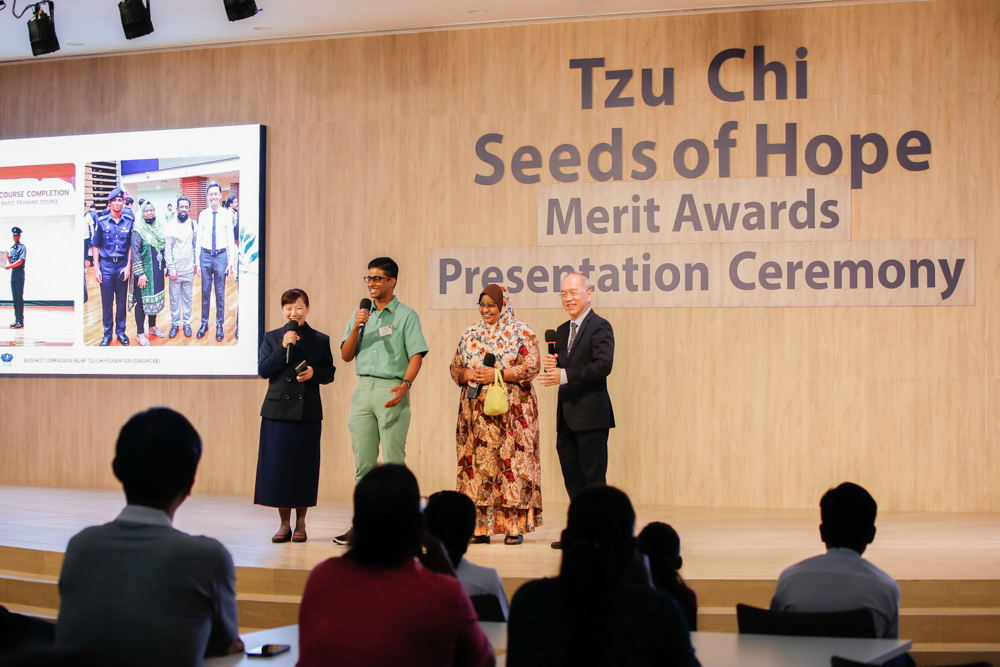新芽励学金鼓励学子在各个领域发挥潜能与专长,奖项分别为学习杰出奖、课外杰出奖、学习进步奖、全勤奖、品德优良奖和孝悌奖。得奖的学生有来自小学、中学、理工学院和工艺教育学院的学生。慈济志工每月上门访视除了关心照顾户家庭状况,也会关心孩子的学习,给予鼓励。颁发典礼上,志工与孩子很欢乐地一起玩问答游戏,这份情感是经过时间累积的。