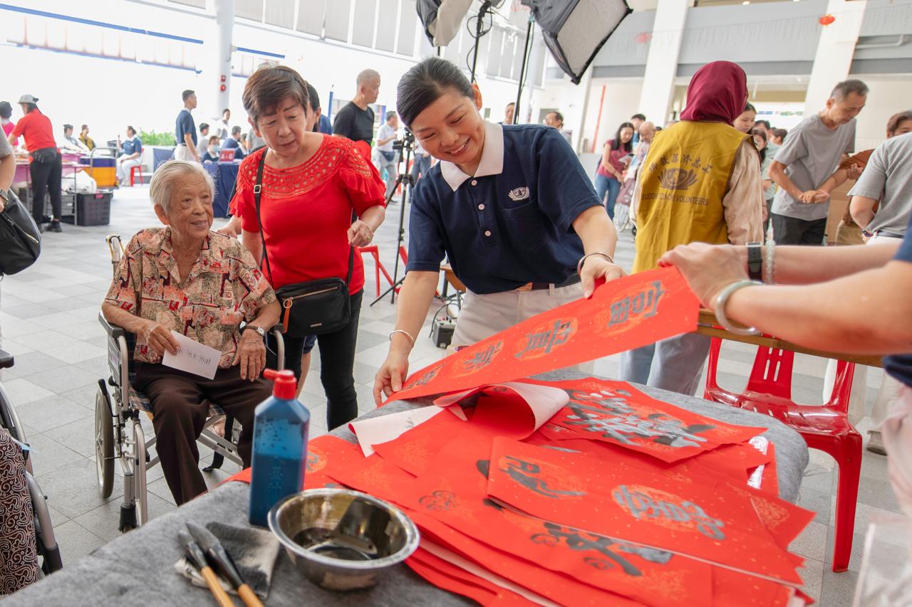 来自中国上海,在新加坡定居超过三十年的书法家朱萍芳,应志工邀请到场挥毫。她不仅事前准备了许多与马年相关的作品,还在现场据照顾户的需求,客制化春联内容。