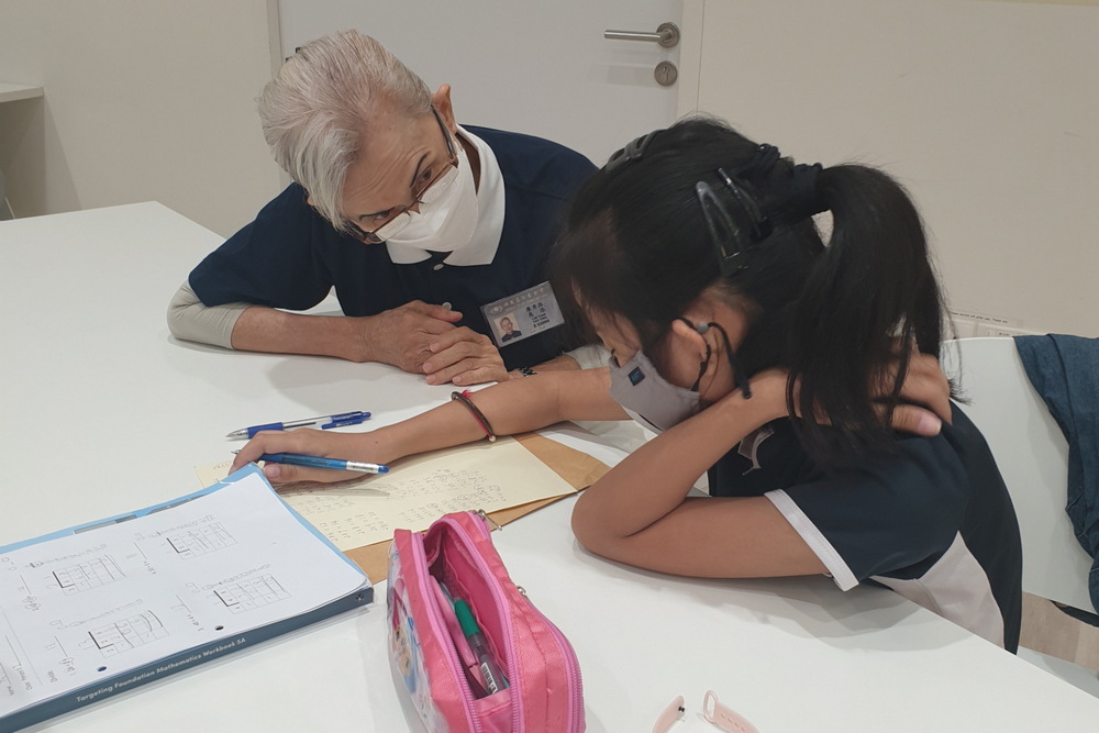 廖秀添(左)正陪伴一位“快乐天堂”学童写作业。(摄/ 莎丽法)