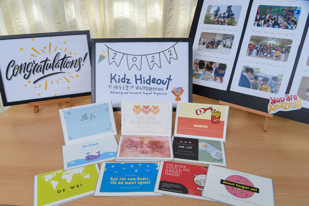 在“快乐天堂”计划的最后告别活动上,策划团队精心为孩子准备了祝福卡和照片。(摄/ 曾美珍)